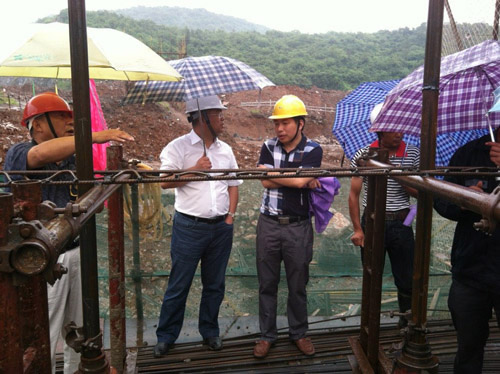 公司董事长张少荣(黄色安全帽)、项目经理吴贞诚陪同中核建设集团安徽分公司方总在施工现场